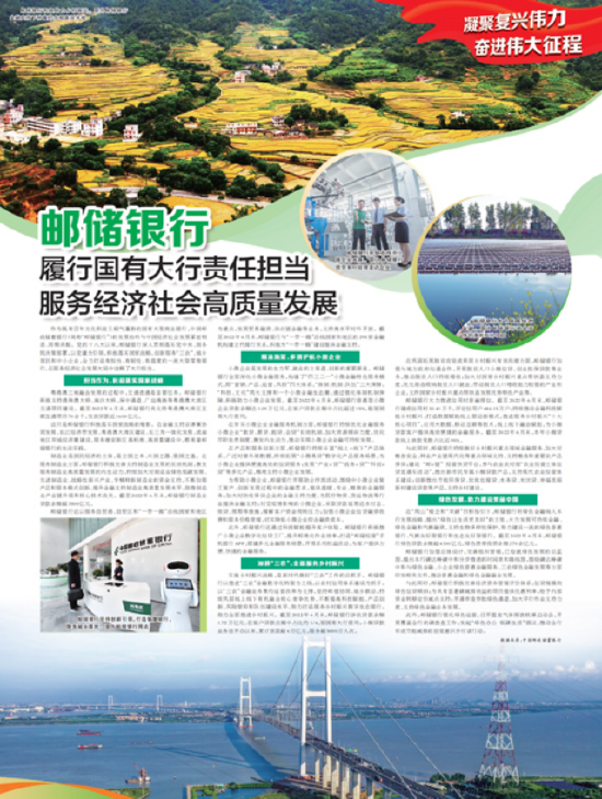作为既有百年文化积淀又朝气蓬勃的国有大型商业银行,中国邮政储蓄银行(简称“邮储银行”)的发展始终与中国经济社会发展紧密相连、同频共振。党的十八大以来,邮储银行深入贯彻落实党中央、国务院决策部署,以党建为引领,积极落实国家战略,创新服务“三农”、城乡居民和中小企业,全力打造有担当、有韧性、有温度的一流大型零售银行,在服务经济社会发展大局中诠释了大行担当。