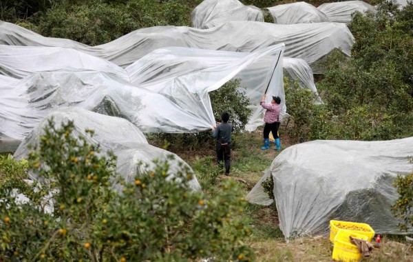 广西融安县大坡乡岗伟村村民在给金桔树盖膜。新华社记者黄耀滕 摄