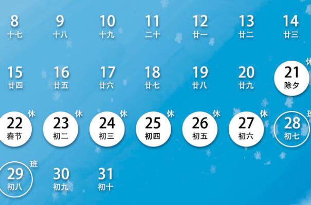 二、春节:1月21日至27日放假调休,共7天。1月28日(星期六)、1月29日(星期日)上班。