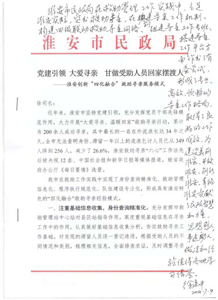 身份查询精准化、救助管理信息化、程序执行规范化、队伍建设专业化,眼下,以“六心”服务理念塑造的淮安特色“四化融合”救助寻亲新模式已经走出淮安,为全国提供经验示范。淮安“寻亲经验”先后被央视12套、中国社会报、新华日报等宣传报道,并受到民政部社会事务司司长徐建中的批示肯定。