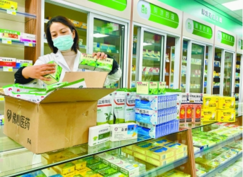 近日,高淳区北岭路的一家药店内,工作人员正在分类整理新到货的感冒清热类药品。记者 段仁虎 摄