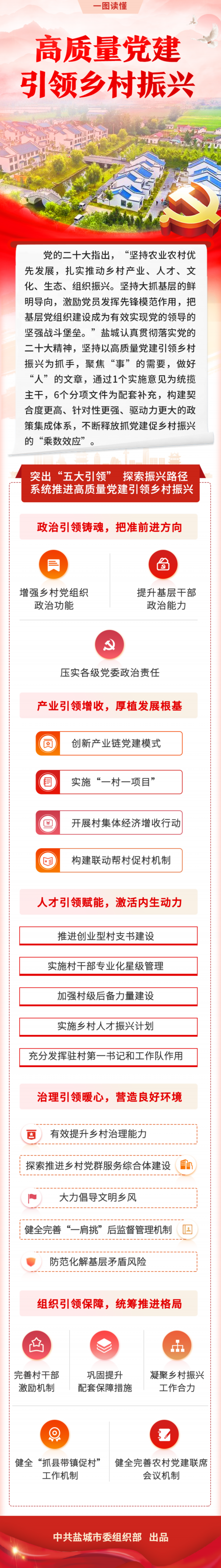 为深入贯彻党的二十大精神,认真落实中央和省、市部署要求,有效破解基层“三农”发展瓶颈,盐城正式出台高质量党建引领乡村振兴“1+6”系列政策文件。