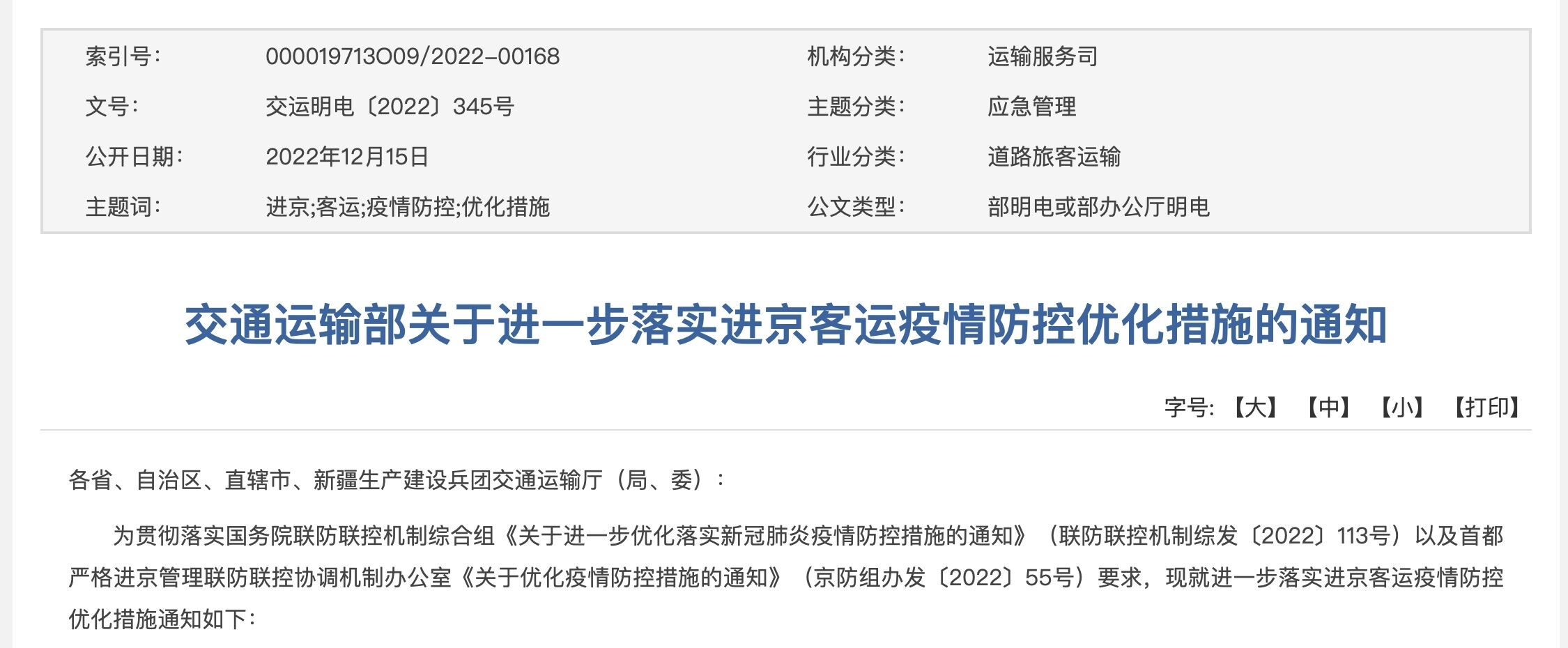 为贯彻落实国务院联防联控机制综合组《关于进一步优化落实新冠肺炎疫情防控措施的通知》(联防联控机制综发〔2022〕113号)以及首都严格进京管理联防联控协调机制办公室《关于优化疫情防控措施的通知》(京防组办发〔2022〕55号)要求,现就进一步落实进京客运疫情防控优化措施通知如下: