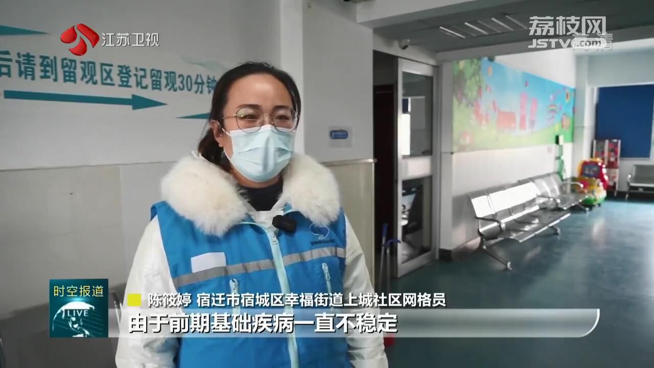 宿迁市宿城区幸福街道上城社区网格员陈筱婷说:“由于前期基础疾病一直不稳定,未完成接种。最近,根据我们上门走访了解,老人身体已经健康良好。我们为徐秀英老人提供专车接送。”