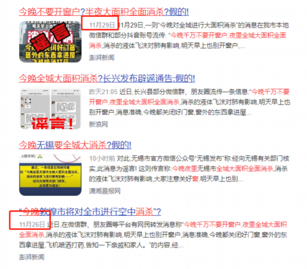 近期,一则内容为“飞机喷洒打药”“全城消杀”的涉疫信息在微信群传播。传言称“今晚千万不要开窗户,夜里全城大面积全面消杀,消杀的液体飞沫对肺有影响,明天早上也别开窗户,消息准确,今晚都关闭好门窗,窗外的东西拿进屋,飞机喷洒打药,告知一下亲戚和家人。”