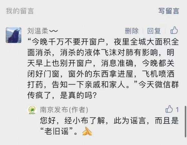12月20日,“南京发布”官方微信也在留言板块对该谣言内容进行了回复和辟谣。请大家切勿相信,南京既没有飞机喷洒打药、也没有进行全城消杀。