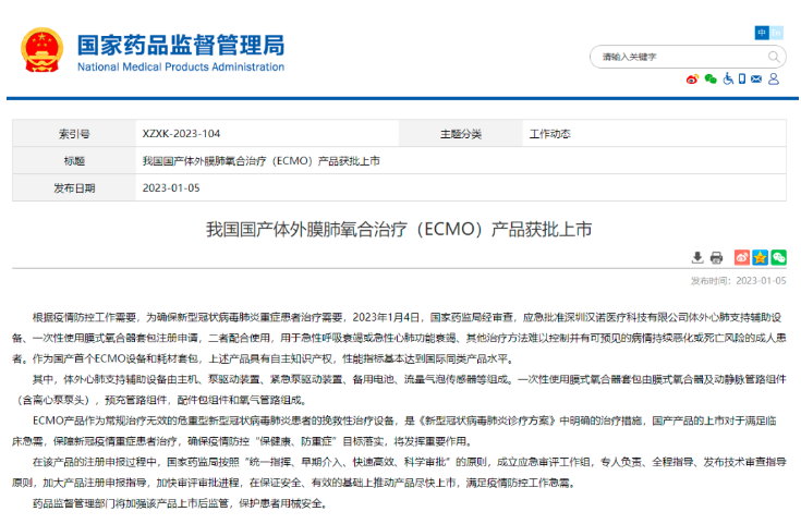 ECMO产品作为常规治疗无效的危重型新型冠状病毒肺炎患者的挽救性治疗设备,是《新型冠状病毒肺炎诊疗方案》中明确的治疗措施,国产产品的上市对于满足临床急需,保障新冠疫情重症患者治疗,确保疫情防控“保健康、防重症”目标落实,将发挥重要作用。