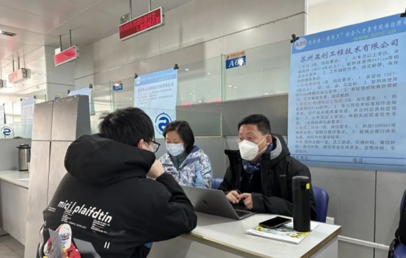 1月29日上午,苏州市人才市场举行新春首场现场招聘会——“迎新春·保用工”综合人才集市现场招聘会,为来苏、返苏的求职者与苏州用人单位之间搭建公益性对接交流平台。