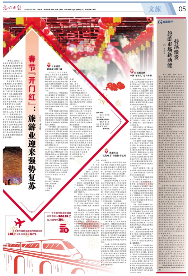 “复苏”“回暖”“向好”“开门红”,随着一系列优化疫情防控政策接续发布和落地见效,这个春节假期,人们怀揣积蓄已久的旅游热情纷纷走出家门,拥抱壮美河山、奔赴诗与远方。文化和旅游部发布的数据显示,今年春节假期,全国国内旅游出游人次同比增长23.1%,恢复至2019年同期的88.6%;国内旅游收入同比增长30%,恢复至2019年同期的73.1%。去南方海岛避寒,去北方享受滑雪、看民俗表演、体验非遗项目、登山祈福、游城逛寨……这个热闹的假期,让人们对今后的旅游市场充满期待:随着消费潜能的加速释放,旅游市场将迎来可观的复苏。
