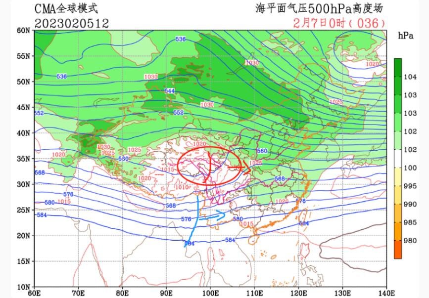 最近,冷空气虽然较弱,但近地面层仍有弱冷空气来扰,给北方降雪提供了气温条件。其次是高原槽、南支槽东移,引导水汽北上的同时又给了较好的抬升动力(图中红线为高原槽,蓝线为南支槽)。