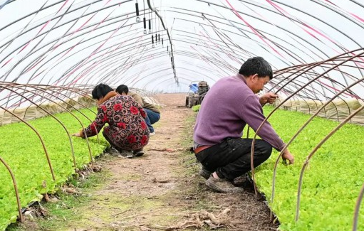 在村里另一户村民王士友家的蔬菜大棚里,绿油油的生菜幼苗整齐划一、垄垄相连,整个大棚内生机勃勃。王士友夫妇和聘请来的工人蹲在垄边,精心打理着每一棵幼苗。
