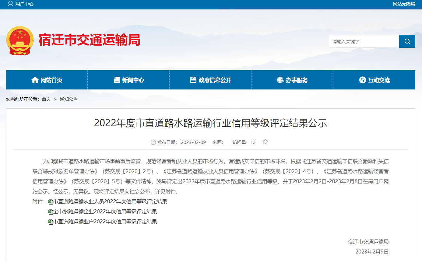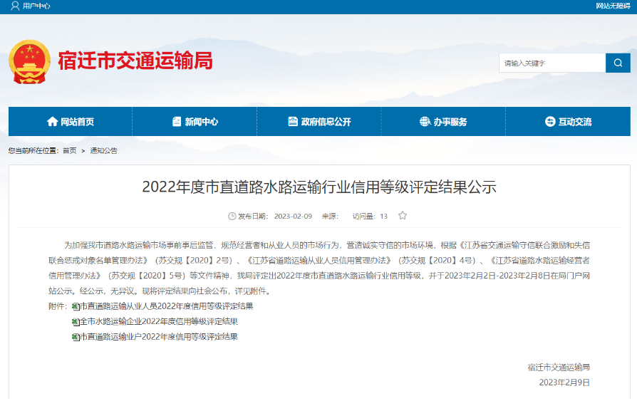 为加强宿迁市道路水路运输市场事前事后监管,规范经营者和从业人员的市场行为,营造诚实守信的市场环境,2月10日,宿迁市交通运输部门完成2022年度全市道路水路运输行业信用等级评定工作,并将评定结果向社会公布。