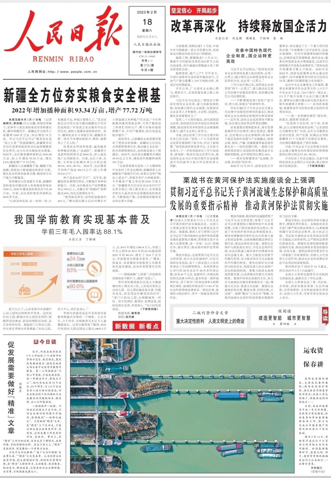 “全面贯彻落实党的二十大精神和中央农村工作会议精神,新疆将深入实施粮食产能提升行动,依靠主攻单产稳定小麦总产,多措并举扩大种植面积,今年粮食产量力争达到2000万吨左右。”新疆维吾尔自治区农业农村厅厅长库尔班江·胡土勒克表示,未来要逐步把永久基本农田全部建成高标准农田,不断提高产量,为保障国家粮食安全作出更大贡献。(原载于2023-02-18《人民日报》头版头条)