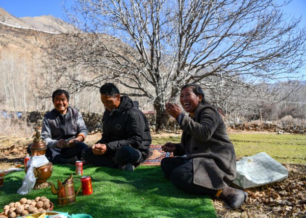 山南市加查县拉岗村村民在核桃树下聊天拉家常(2月1日摄)。新华社记者晋美多吉 摄
