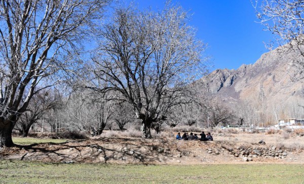山南市加查县拉岗村的村民在核桃树下聊天拉家常(2月1日摄)。新华社记者格桑边觉 摄