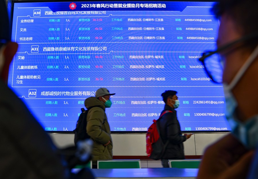Job seekers are pictured at a job fair in Lhasa, capital of southwest China's Tibet Autonomous Region, Feb. 8, 2023. (Xinhua/Jigme Dorje)