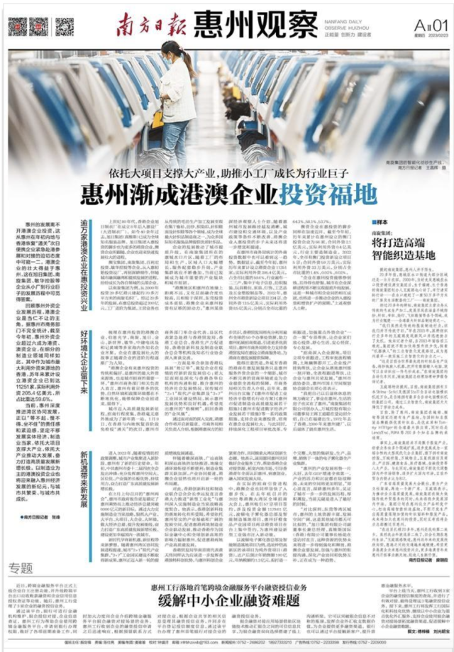 当前,惠州深度推进湾区协同发展,正以“等不起、慢不得、坐不住”的责任感和紧迫感,坚定不移发展实体经济、制造业当家,依托大项目支撑大产业,依托大产业推动大发展,奋力打造高质量发展新增长极。以制造业为主的港澳投资企业也将迎来融入惠州经济发展的新阶段,与城市共繁荣、与城市共成长。