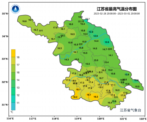 最高温度:本省东南部地区16~17℃,西北部地区19~20℃,其他地区18℃左右;