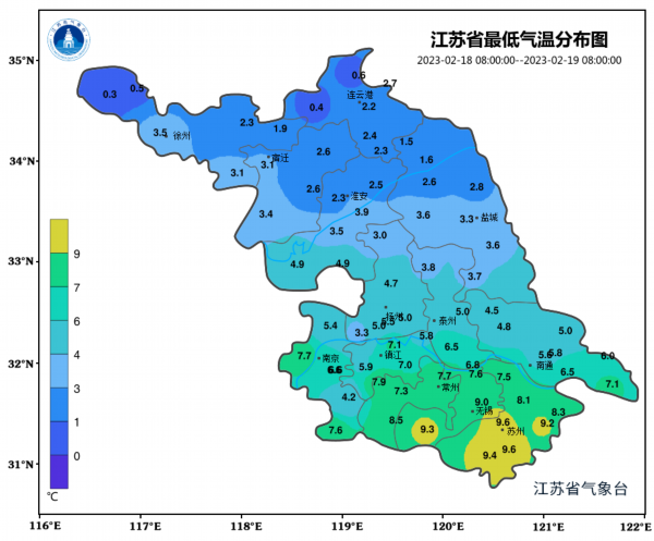 最低温度:沿江和苏南地区2℃左右,本省东北部地区-1~-2℃,其他地区1℃左右。