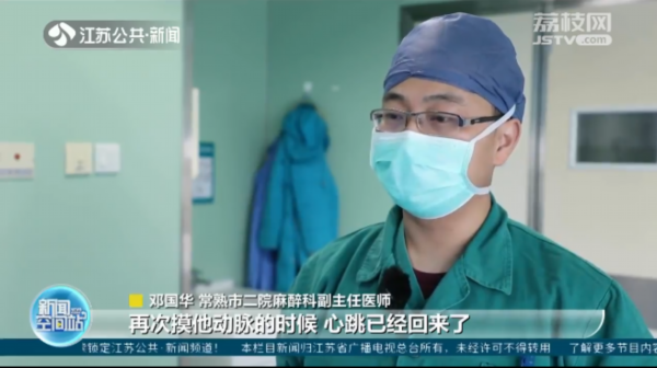 “再次摸他动脉的时候,心跳已经回来了,已经摸到动脉的搏动了,慢慢他眼睛也睁开了,整个心肺复苏持续了五到六分钟,按压次数在1000次以上。”邓国华说。