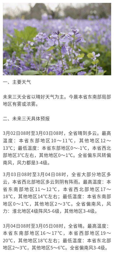 未来三天全省以晴好天气为主,今晨本省东南部局部地区有雾或浓雾。3月02日08时至3月03日08时,全省晴到多云。最高温度:本省东部地区10~11℃,其他地区12~13℃;最低温度:本省东部地区0~-1℃,本省西北部地区3℃左右,其他地区0~1℃。全省偏东风转偏南风,风力都是3-4级。