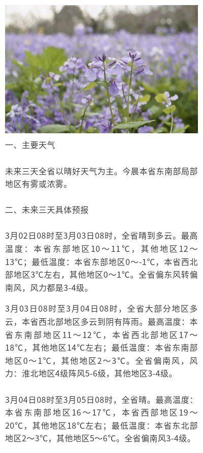 据我苏网 未来三天全省以晴好天气为主,今晨本省东南部局部地区有雾或浓雾。3月02日08时至3月03日08时,全省晴到多云。最高温度:本省东部地区10~11℃,其他地区12~13℃;最低温度:本省东部地区0~-1℃,本省西北部地区3℃左右,其他地区0~1℃。全省偏东风转偏南风,风力都是3-4级。 详情>>