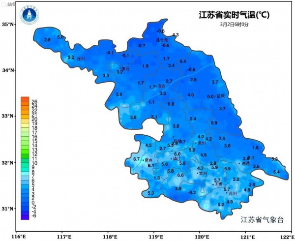 今天早上6时,全省气温都偏低,沿江和苏南地区5到6℃左右,本省东北部地区0℃左右,其他地区2到3℃左右。