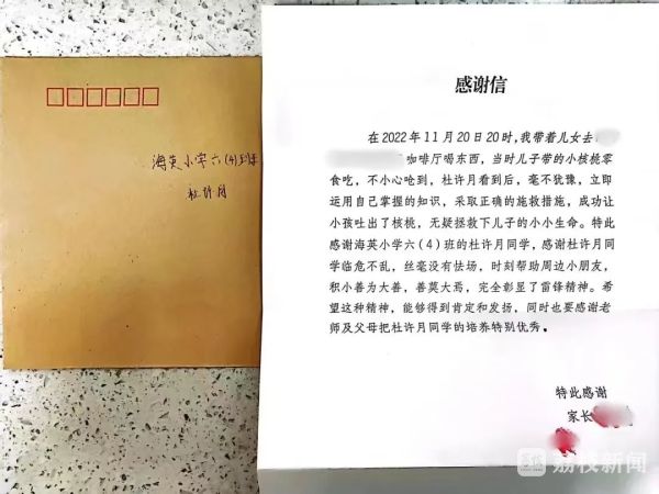 学雷锋纪念日来临之际,南京市海英小学六年级的杜许月收到了一封感谢信, 信中这位妈妈讲述了3个月前,杜许月救下她儿子的故事。