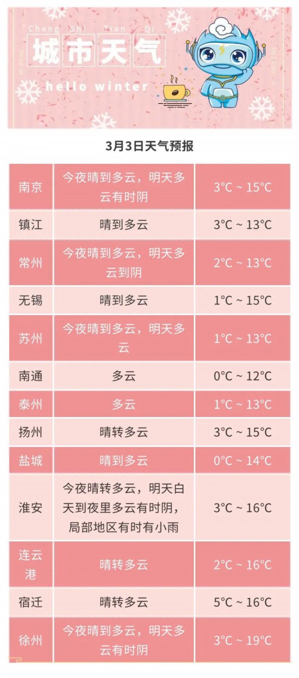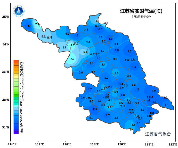 今晨,长江以北地区气温在-1°C到4°C左右,苏南地区气温稍高,最高气温在7°C左右。早晚有温差,请注意适时添减衣物哦。