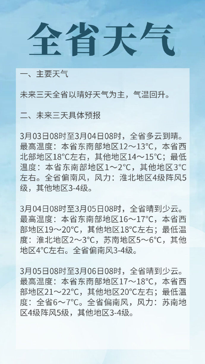 3月03日08时至3月04日08时,全省多云到晴。最高温度:本省东南部地区12~13℃,本省西北部地区18℃左右,其他地区14~15℃;最低温度:本省东南部地区1~2℃,其他地区3℃左右。全省偏南风,风力:淮北地区4级阵风5级,其他地区3-4级。