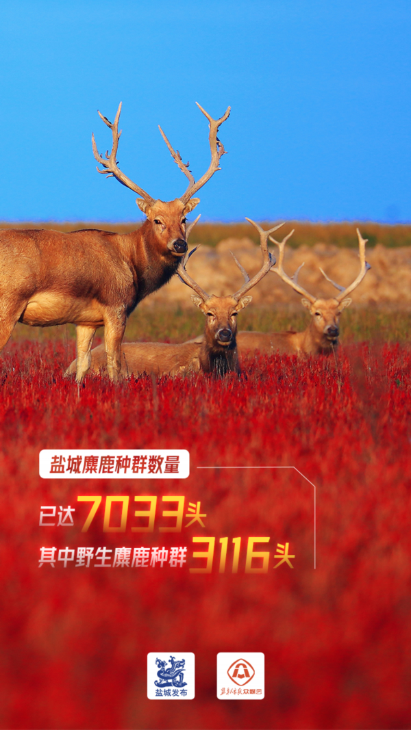 麋鹿是我国特有物种,为国家一级保护动物,曾繁盛地生活在沿海滩涂。1986年,麋鹿保护区正式建立,国家从英国重新引进39头麋鹿,落户大丰黄海滩涂。最新统计显示,这里的麋鹿种群数量已达7033头,其中,野生麋鹿种群3116头。