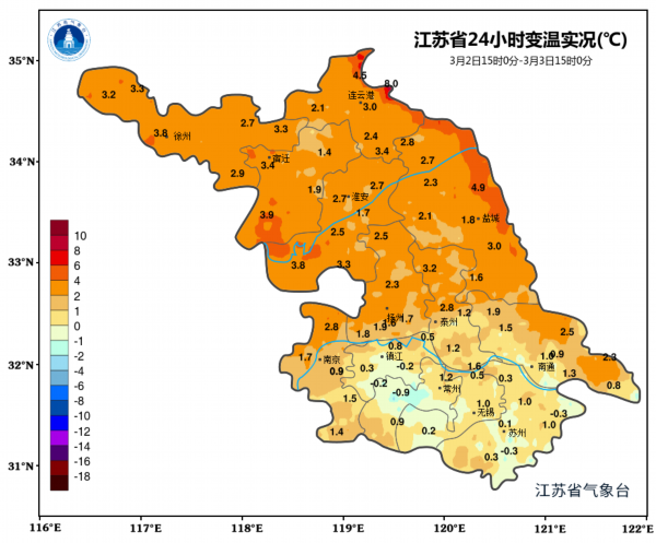 这两天的天气,则突出一个“暖”字,回暖的步伐势不可挡,咱江苏的温度也在持续上升,今天15点,全省最高气温在18℃左右。