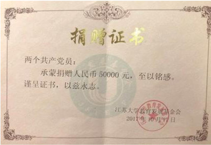 此后,江苏大学每隔几年就会收到一笔捐款,每次的署名始终是“两个共产党员”。2021年5月,“两个共产党员”一次性捐款25万元,同时给江苏大学党委写信,希望设立奖学基金,用以奖励品学兼优、家庭经济困难的学生。