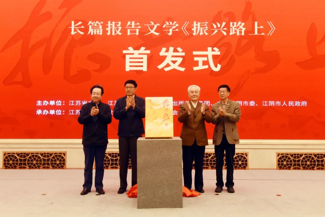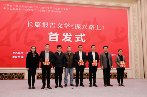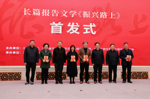 3月4日,长篇报告文学《振兴路上》在南京西康宾馆举行了首发式。原南京军区上将司令员朱文泉,十三届全国政协提案委员会副主任、江苏省政协原主席蒋定之,省委原副书记顾浩,省人民政府原副省长李全林,省委宣传部副部长徐宁,省文联主席、省报告文学学会会长章剑华,省作协党组书记、副主席、书记处第一书记汪兴国,省文旅厅党组成员、副厅长钱钢,省乡村振兴局二级巡视员褚夫运,无锡市委常委、江阴市委书记许峰,省文联党组成员、副主席、书记处书记刘旭东,省文联党组成员、书记处书记何超,省作协副主席、省评协主席汪政,凤凰出版传媒集团总编辑徐海,新华日报社原副总编辑金伟忻,以及来自省文联、省作协、江苏人民出版社、省报告文学学会、南京市作协以及无锡市、江阴市、周庄镇相关部门的领导嘉宾和山泉村的村民代表出席开幕式。朱文泉、蒋定之、顾浩、李全林共同为新书揭幕。