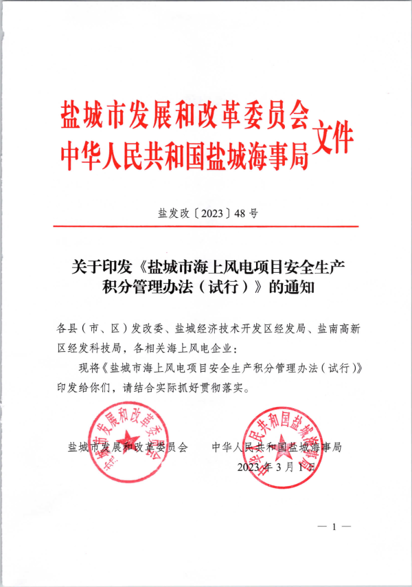 近年来,盐城市海上风电产业蓬勃发展,已建成海上风电场23座、风机1355台,升压站19座和高抗站1座,总装机容量541.25万千瓦,已建海上风电场项目及装机规模均居全国前列。为不断规范海上风电安全管理,盐城市探索形成了“政府领导、部门配合、企业落实”的“1+N”海上风电综合管理机制,在此基础上,近日盐城市发改委与盐城海事局又联合印发《盐城市海上风电项目安全生产积分管理办法(试行)》,旨在推动海上风电企业由“要我安全”向“我要安全”转变,不断夯实海上风电安全生产基础。