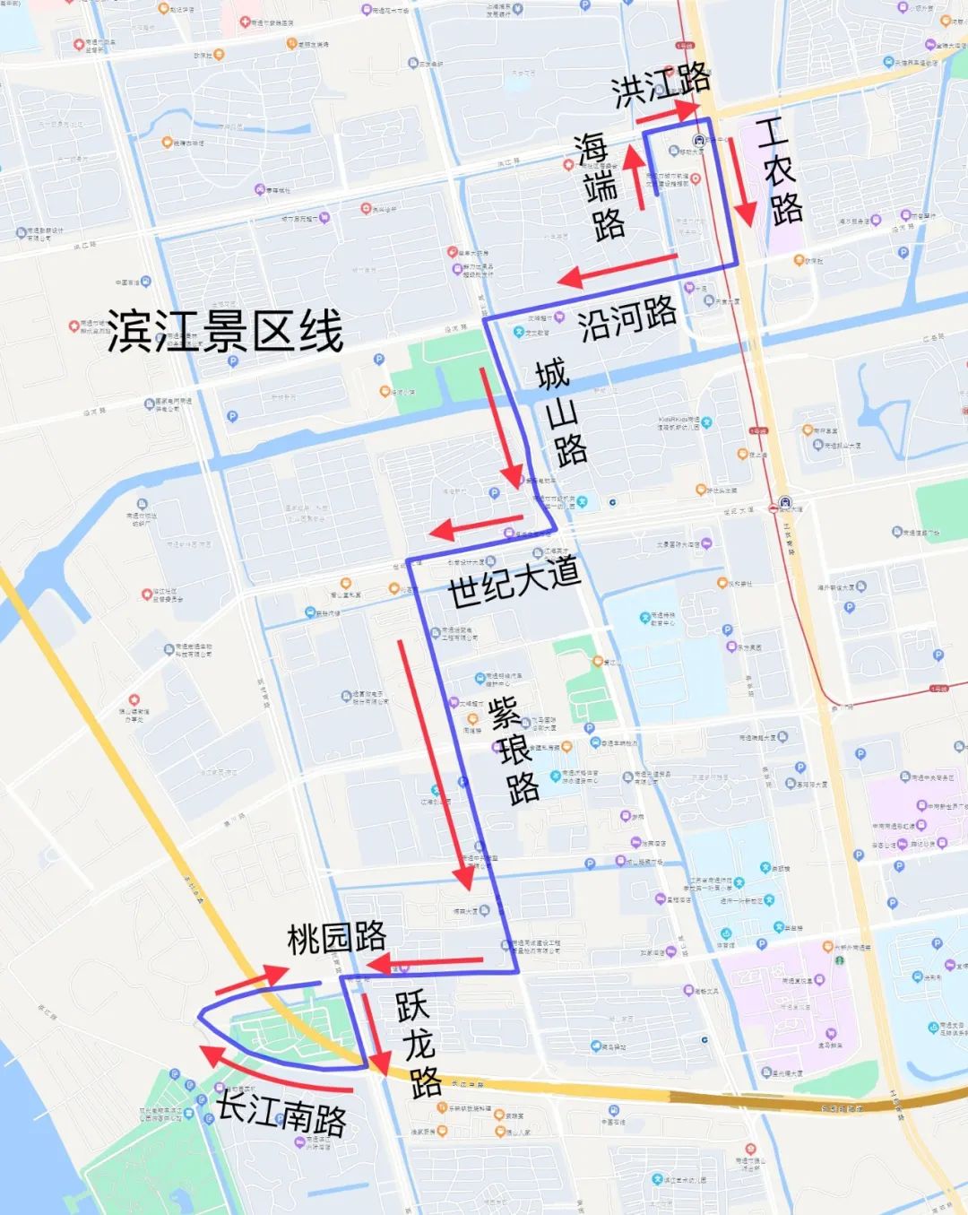 ● 线路走向:海端路—洪江路—工农路—沿河路—城山路—世纪大道—紫琅路—桃园路—跃龙路—长江南路—桃园路