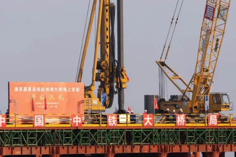 3月10日11时28分,南通至宁波高铁杭州湾跨海铁路桥海上首个桩基开钻,标志着这座世界最长跨海高速铁路桥海上工程正式开工。