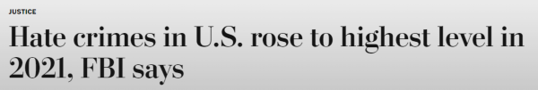 另据《华盛顿邮报》网站13日报道,美国联邦调查局(FBI)年度仇恨犯罪报告的补充文件显示,2021年美国仇恨犯罪数量激增,达到了创历史新高的近1.1万起,较前一年上涨了31%。