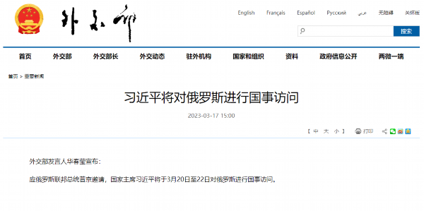 中国网3月20日讯(记者 蒋新宇)3月17日,外交部发言人华春莹宣布:应俄罗斯联邦总统普京邀请,国家主席习近平将于3月20日至22日对俄罗斯进行国事访问。