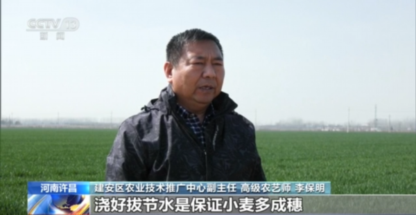 河南许昌建安区农业技术推广中心副主任 高级农艺师 李保明:在小麦灌浆的前期,小麦即将拔节,浇好拔节水是保证小麦多成穗、抵御倒春寒最有效的管理措施。