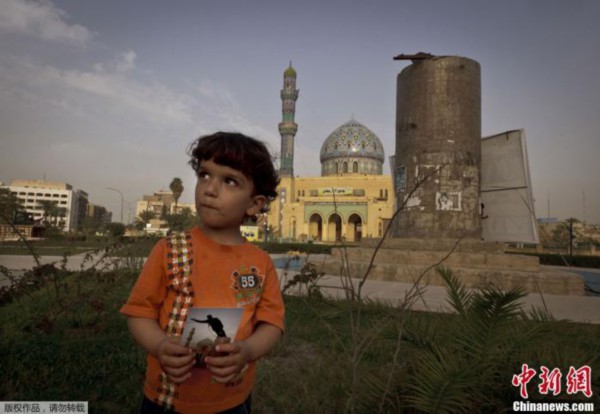 资料图:2013年3月14日,伊拉克巴格达,3岁的Hussein站在菲尔杜斯广场上,拿着一张2003年4月9日在同一地点拍摄的美军推倒萨达姆雕像的照片。