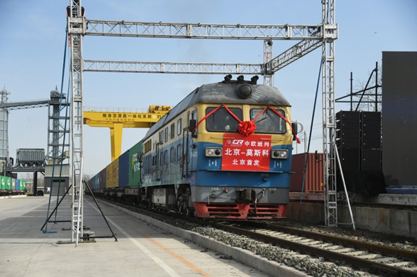 在北京平谷地方铁路马坊站,京平综合物流枢纽中欧班列(北京-莫斯科)发车(2023年3月16日摄)。新华社记者 任超 摄