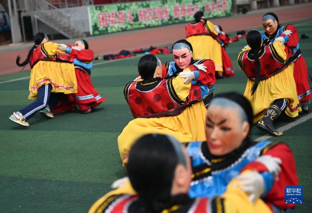 3月20日,隆化县职教中心学生在练习国家级非遗项目“二贵摔跤”(无人机照片)。