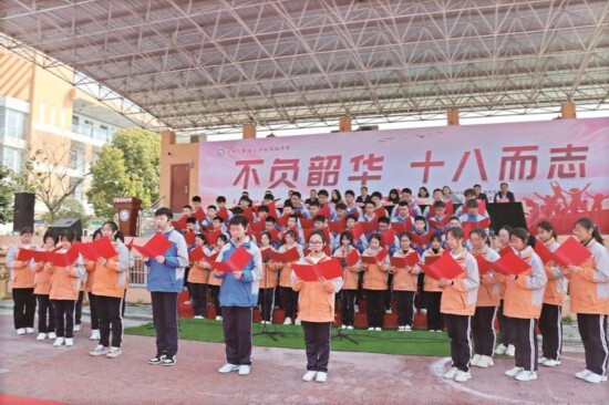 诗歌朗诵《十八岁,唱响青春》吹响了青春战场奋进的号角;班主任们向各班同学送上《宪法》,照亮了“青春需要与法同行”的征程;高二(15)班学生陈诗蕊带着大家举行“十八岁成人礼”宣誓,共同喊响“以我火红青春,建设锦绣中华”的誓言。