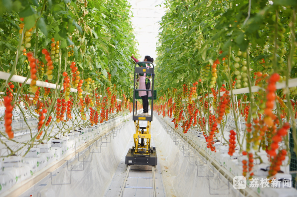 普通的农业种植,往往要靠天吃饭,在常州溧阳市上兴镇的一座“五星级”温室内,一排排3米多高的番茄植株在精心呵护下,实现了全年、全天候生产,调整光照、浇水施肥、修剪叶片等操作,都能通过系统指令进行操控。仅靠十余名工人,这里每天都能产出数吨小番茄销往高端市场。