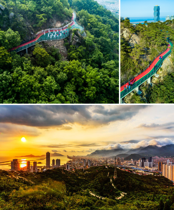 在连云区北固山有一条“网红”健身步道。步道环山而建,全程5000米,集防火栈道、景观平台、悬空栈道、植被绿化、休闲运动为一体。沿途设有观景平台11处,观景亭2处,可欣赏茂密的森林植被、美丽的山海景观和海滨城市风光。