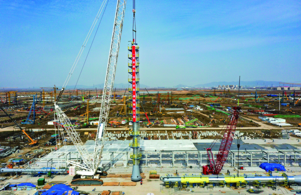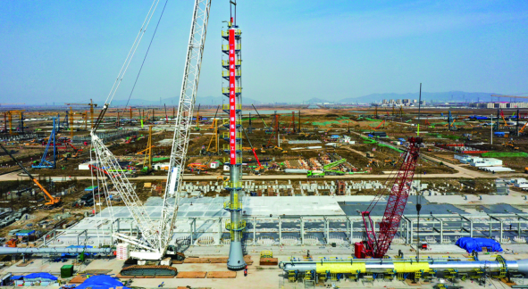 △ 徐圩新区盛虹化工新材料项目碳五碳九装置首塔——脱碳四塔顺利完成起吊安装,成为项目第一台安装落座的大件塔器。