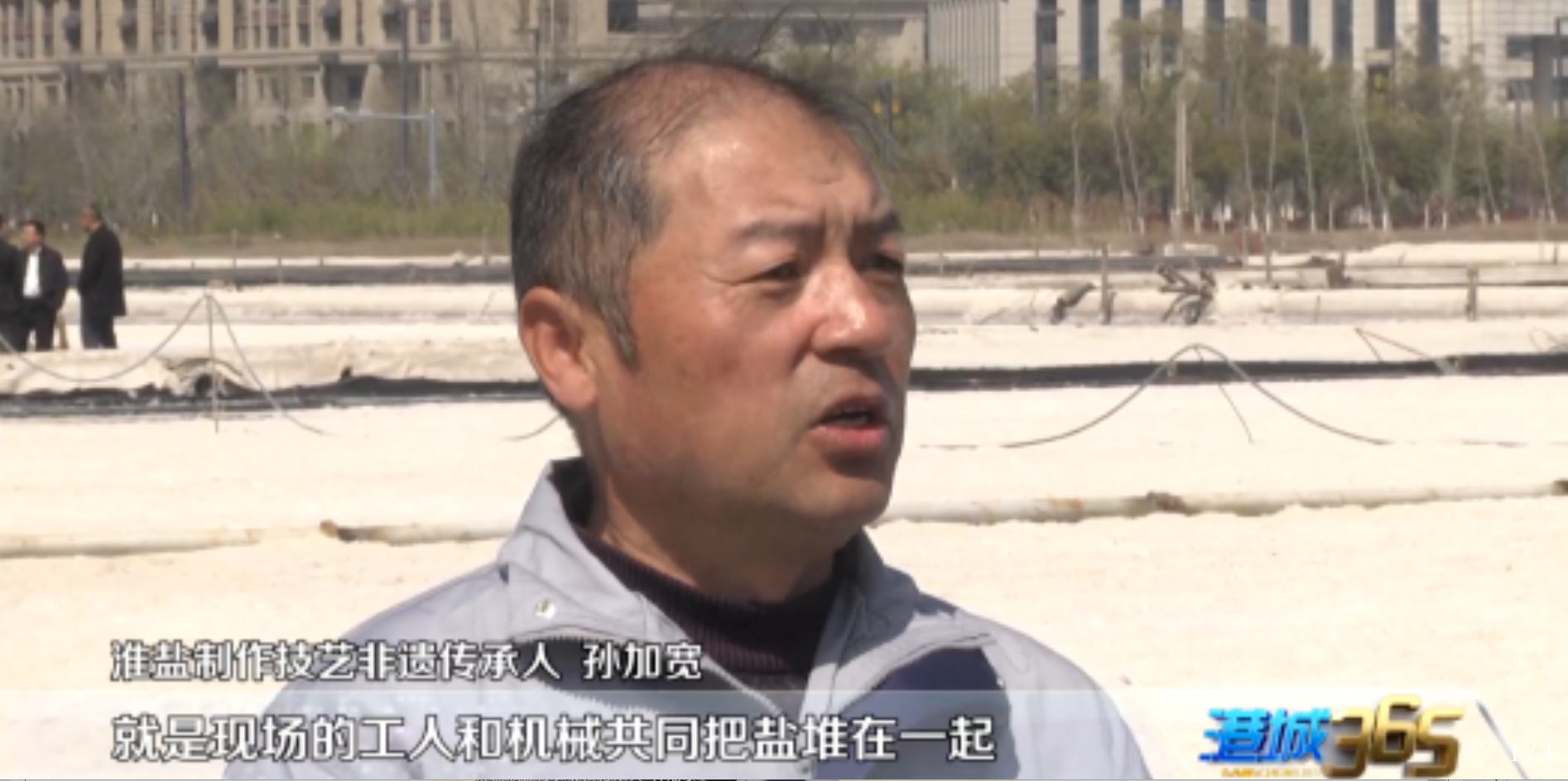 淮盐制作技艺非遗传承人孙加宽表示,我们正在进行淮盐制作的最后一道工序收盐,就是现场的工人和机械共同把盐堆在一起,通过卤水混合,经过吸沙泵,通过管道将盐送到盐廪上,堆放半年就可以销售了。