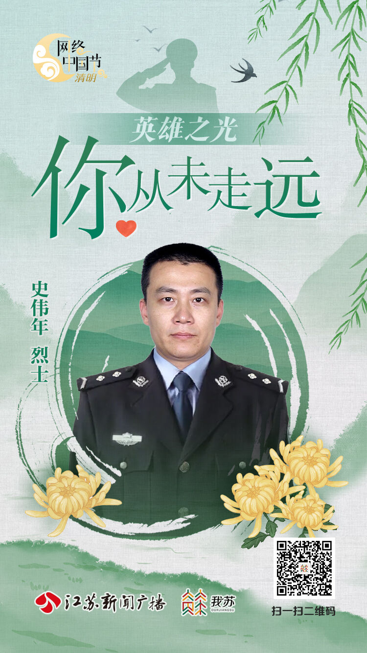 史伟年,1970年3月出生于江苏南京,中共党员。1989年3月,19岁的史伟年应征入伍,2000年10月转业参加公安工作。17年从警生涯,见证了他燃烧的青春。仅他牺牲前的近十年里,就累计查处超速驾驶、酒后驾驶等交通违法案件2.2万余起,2019年,江苏省政府评定史伟年同志为烈士。