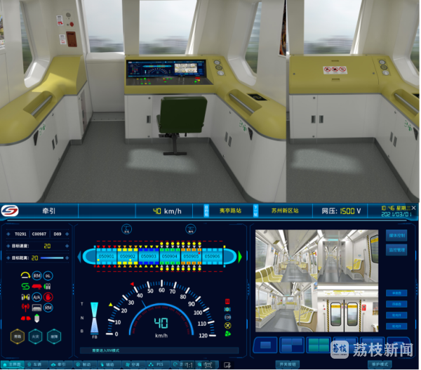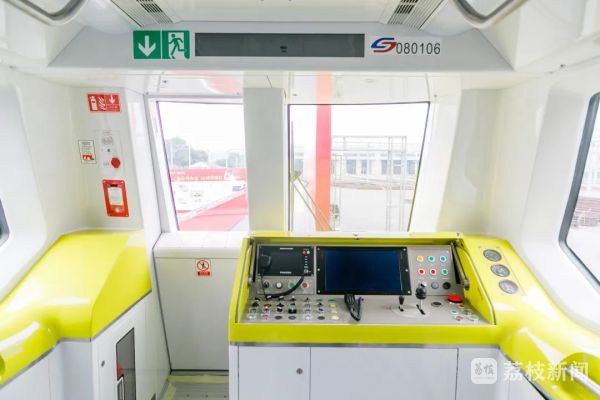 司机室区域为敞开式设计,与客室空间融合贯通,内饰、照明、通风系统也与客室融为一体,司机室区域设置隐藏式软隔断。车辆网络显示屏、信号显示屏、CCTV监控屏进行三屏合一设计,司机台整体布局效果更佳,极大提高司乘人员人机交互体验。采用整体式碳纤维司机台盖板,搭配一键自动开/闭装置,更可靠、更便捷。
